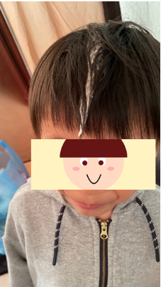 ここで我が家のアクシデントをご紹介します。長男がテントから出てくると頭に何か白いものがついていることに気づきました。